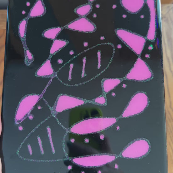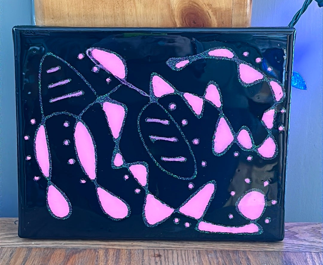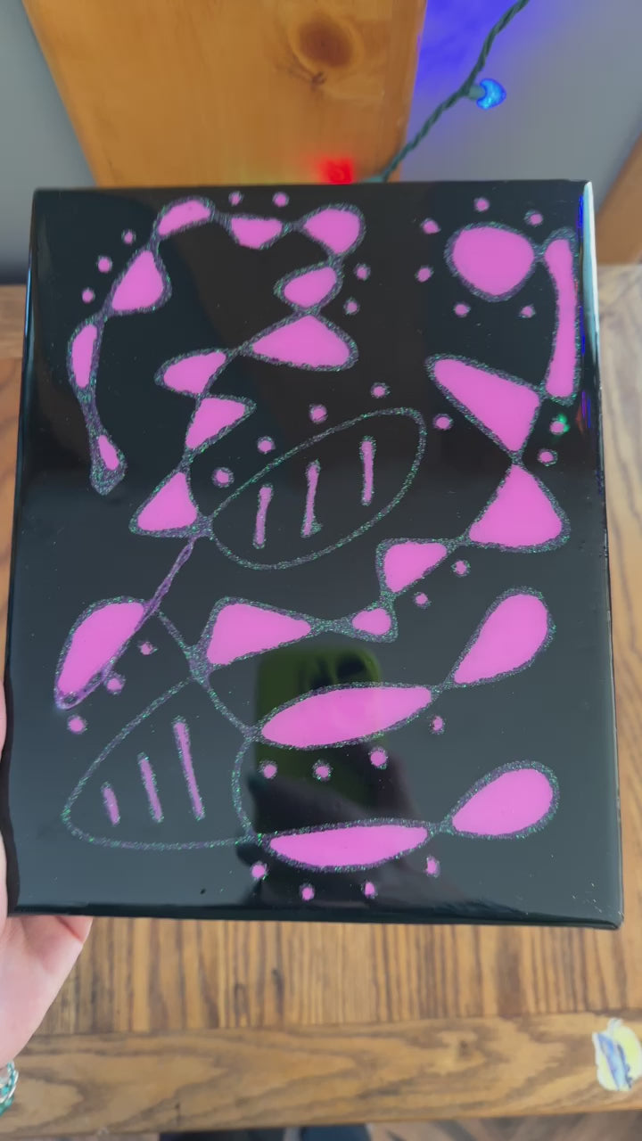 Mixed media artwork 8”x 10”in piece. Black painted background with glue and glitter design and pink details sealed in a minimum of 2 layers of resin. Slight bumps and imperfections are normal with the media being used. Handmade in Maine with ❤️