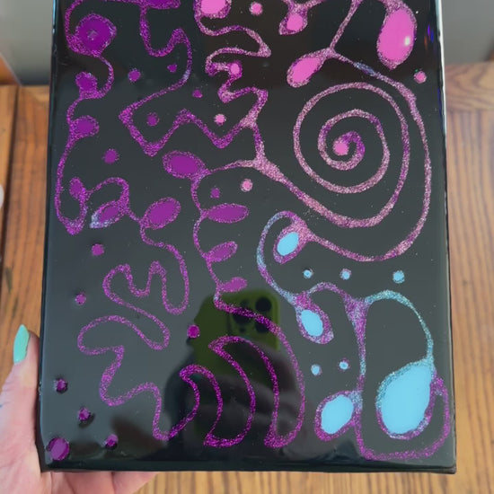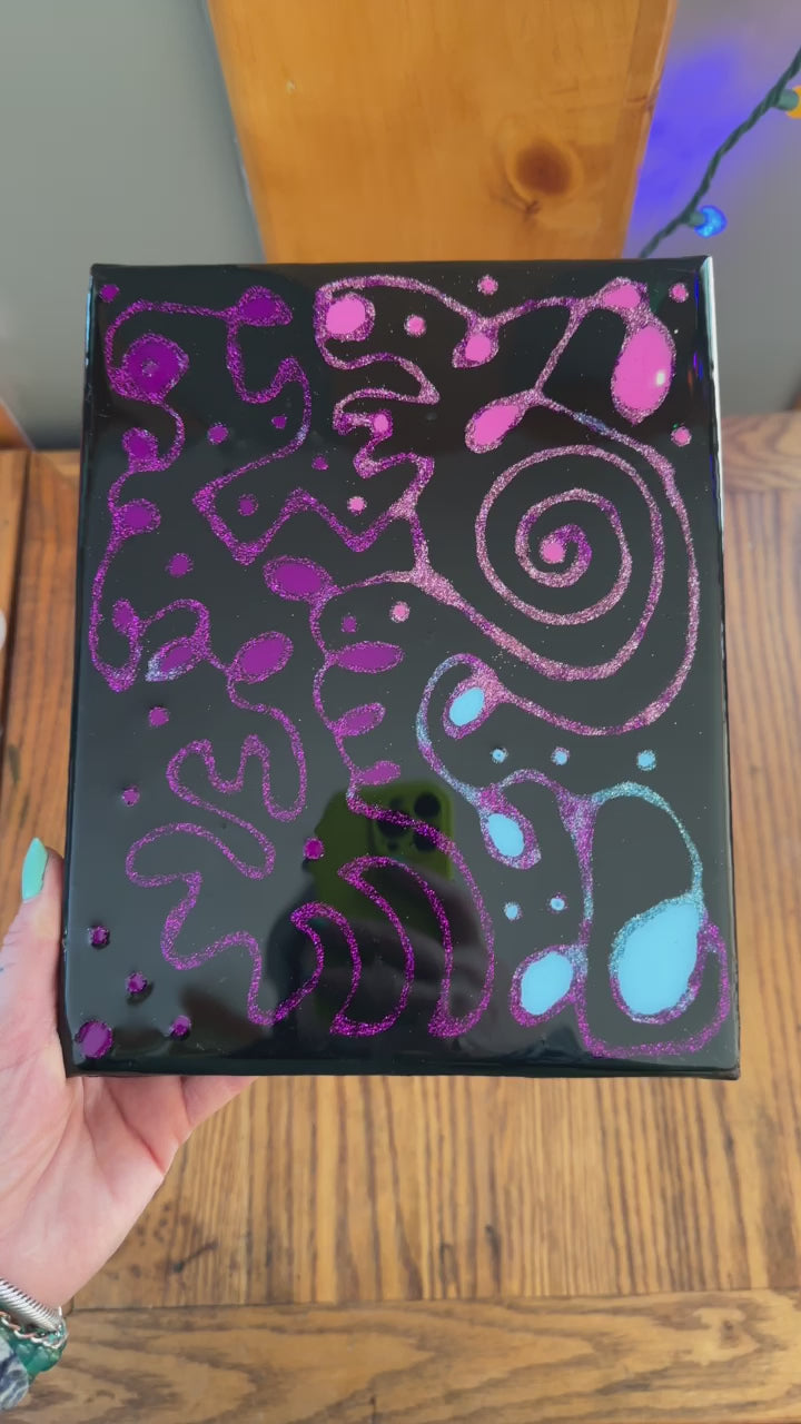 Mixed media artwork 8”x 10”in piece. Black painted background with glue and glitter design and pink, blue and fuchsia details sealed in a minimum of 2 layers of resin. Slight bumps and imperfections are normal with the media being used. Handmade in Maine with ❤️