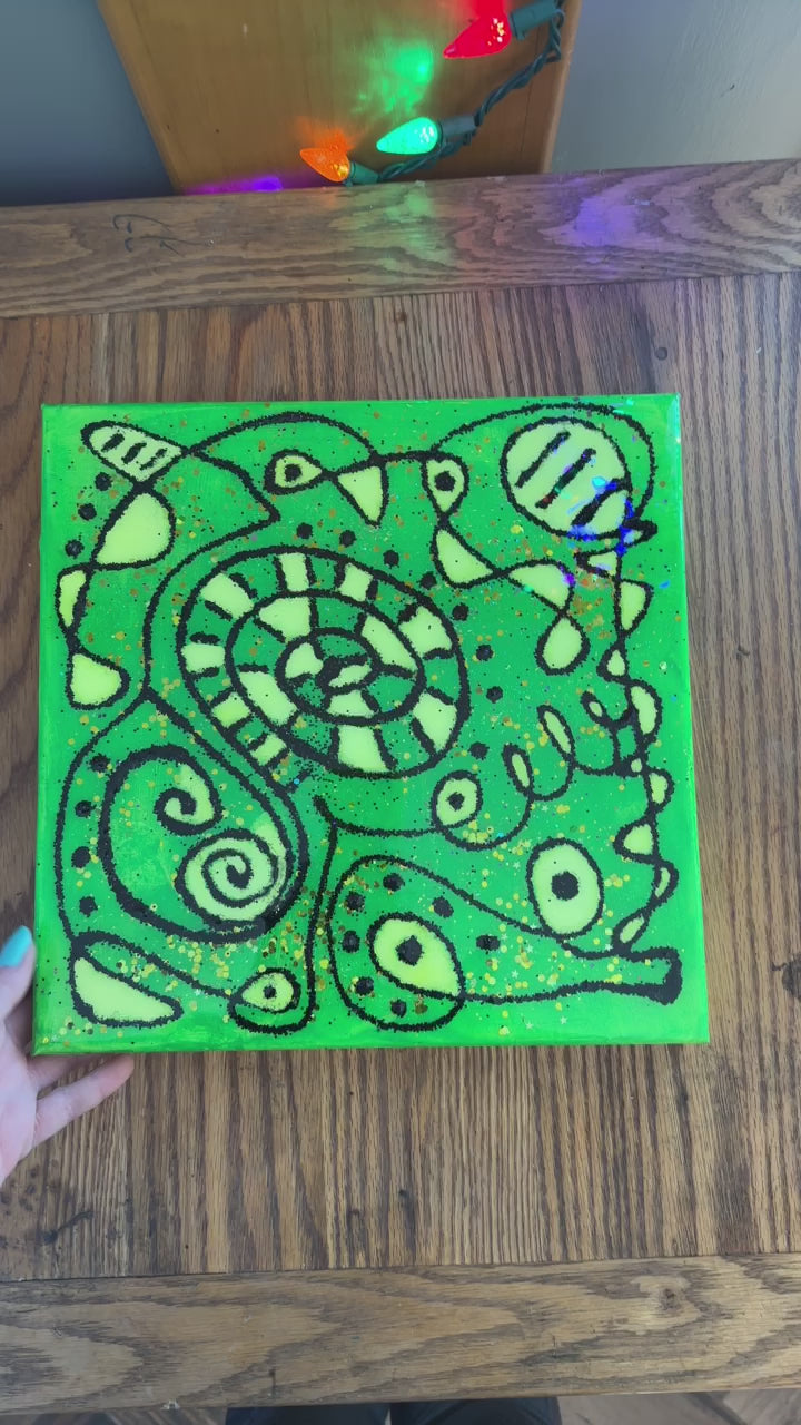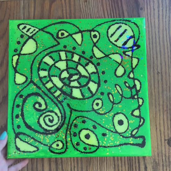 Mixed media artwork 12”x 12”in piece. Neon green painted background with glue and glitter design and neon yellow details sealed in a minimum of 2 layers of resin. Slight bumps and imperfections are normal with the media being used. Handmade in Maine with ❤️