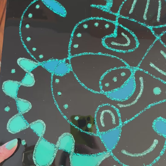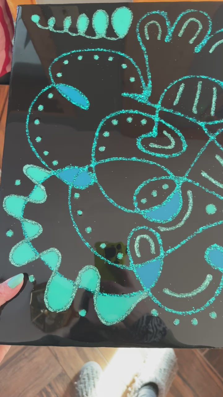 Mixed media artwork 14”x 18”in piece. Black painted background with glue and glitter design and teal blue and aqua details sealed in a minimum of 2 layers of resin. Slight bumps and imperfections are normal with the media being used. Handmade in Maine with ❤️