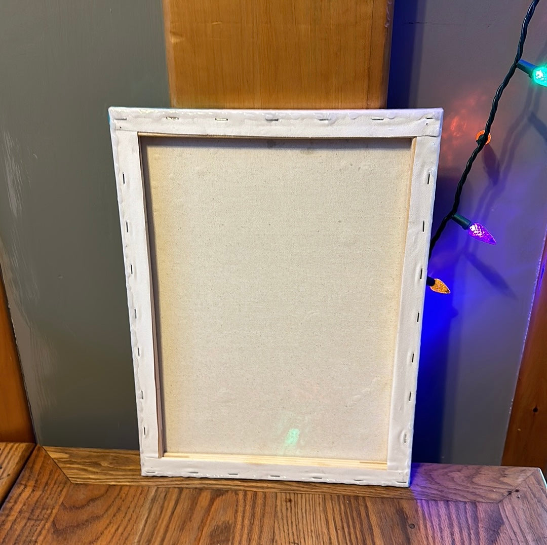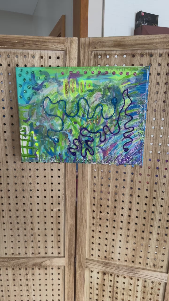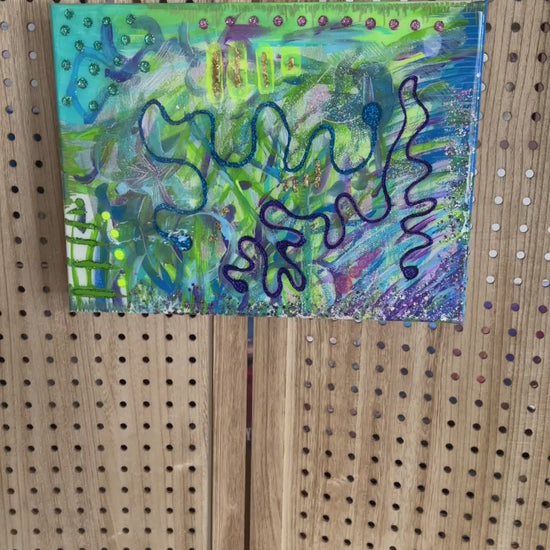 Mixed media artwork 12”x 16”in piece. Abstract painted background with glue, glitter and gold leaf design sealed in a minimum of 2 layers of resin. Slight bumps and imperfections are normal with the media being used. Handmade in Maine with ❤️