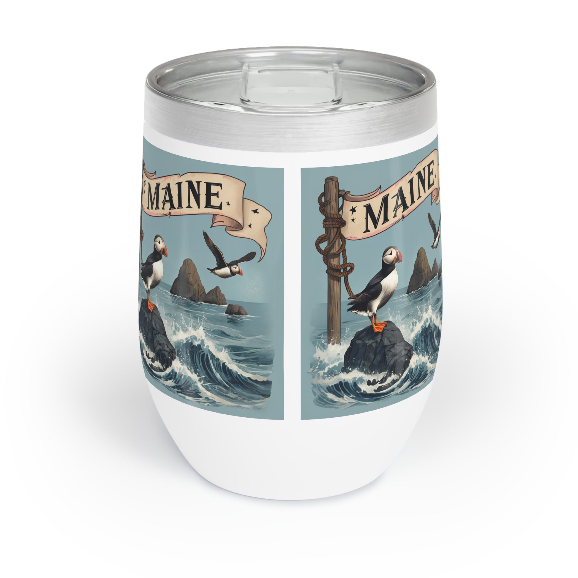 Puffin Maine Wine Tumbler, Coastal Bird Lover Gift, Nautical Animal Print Cup, Sea Life Travel Mug, Beach House Decor, Cute Puffin Drinkware