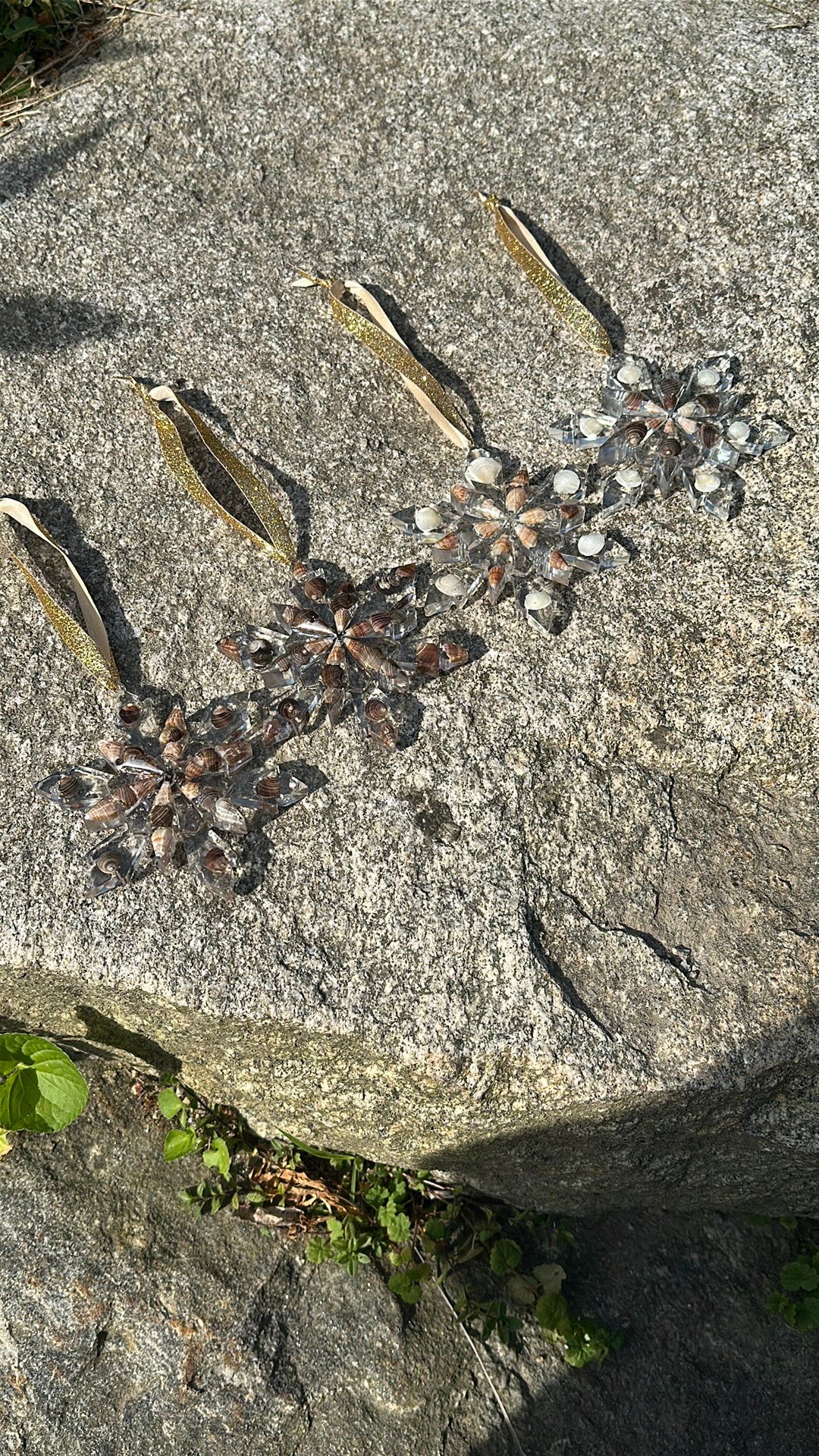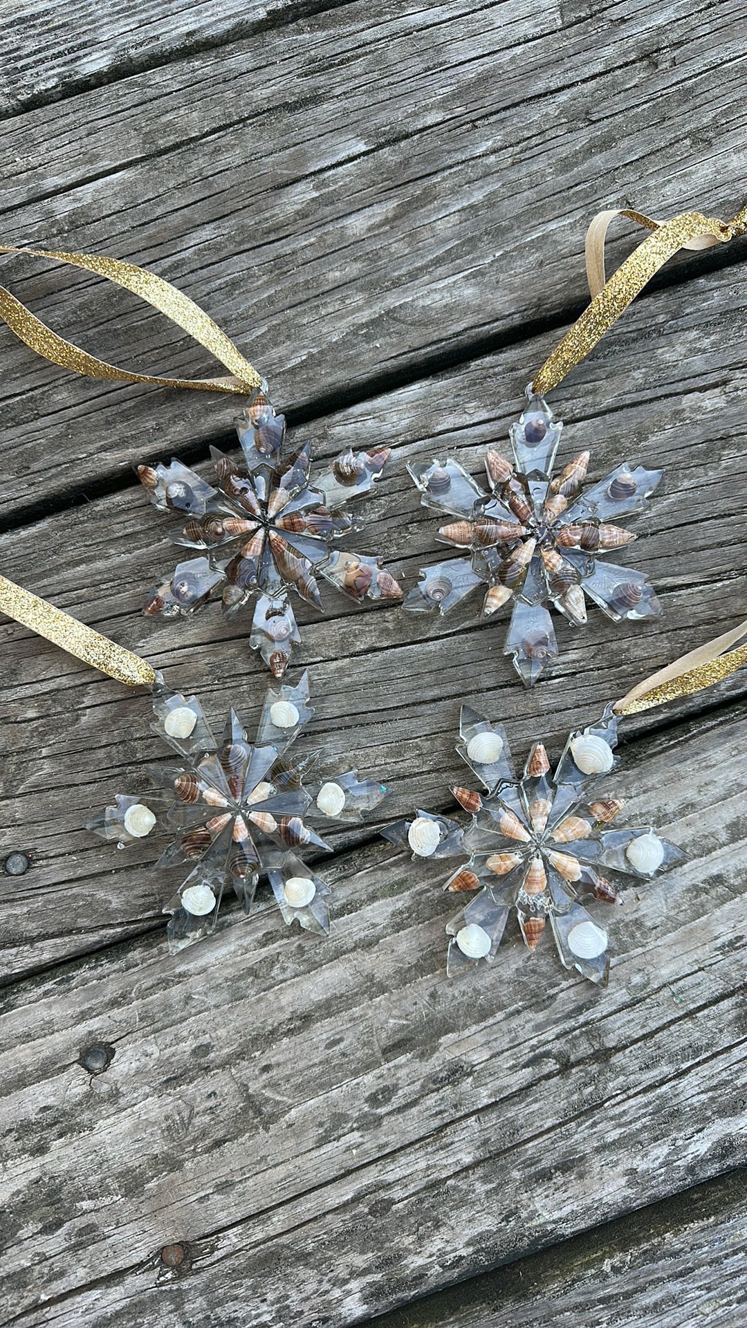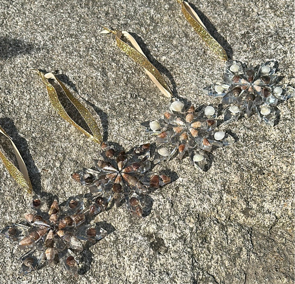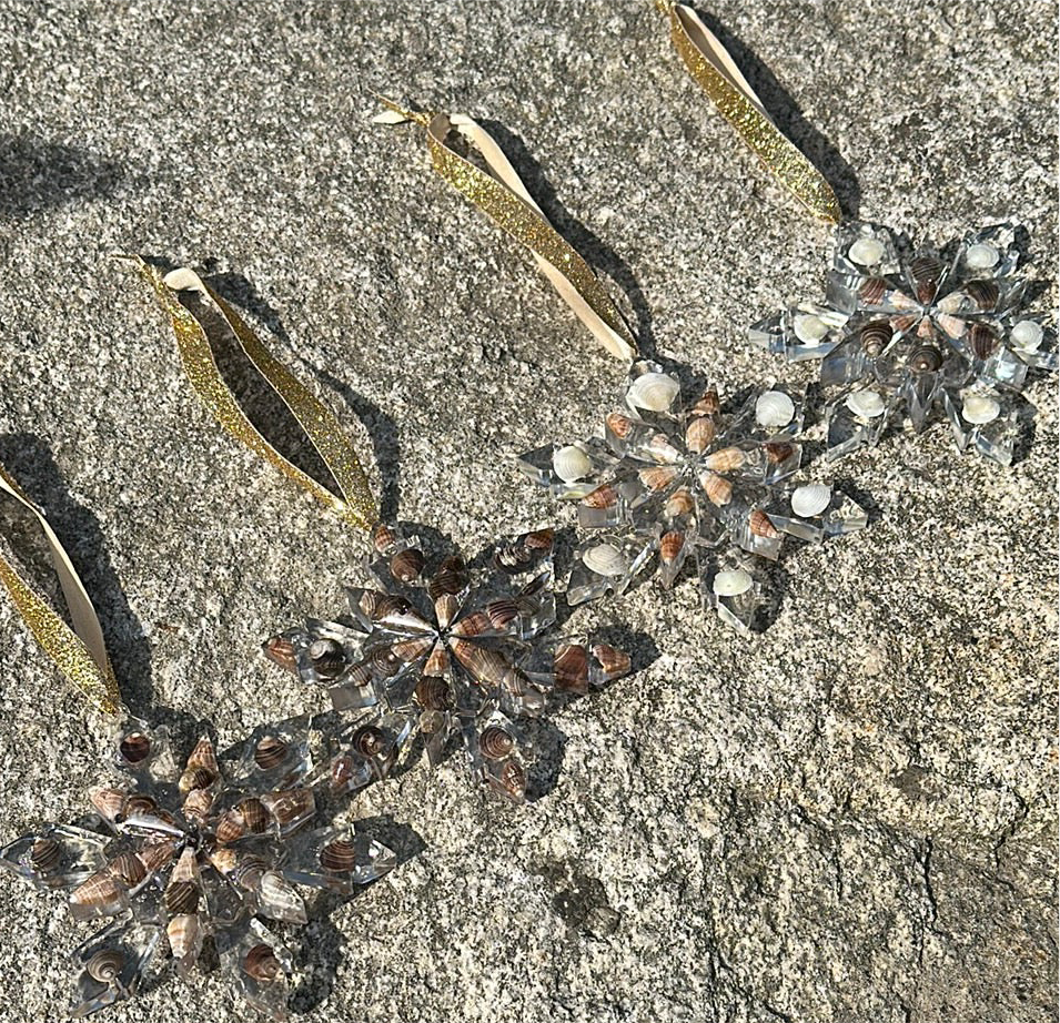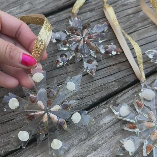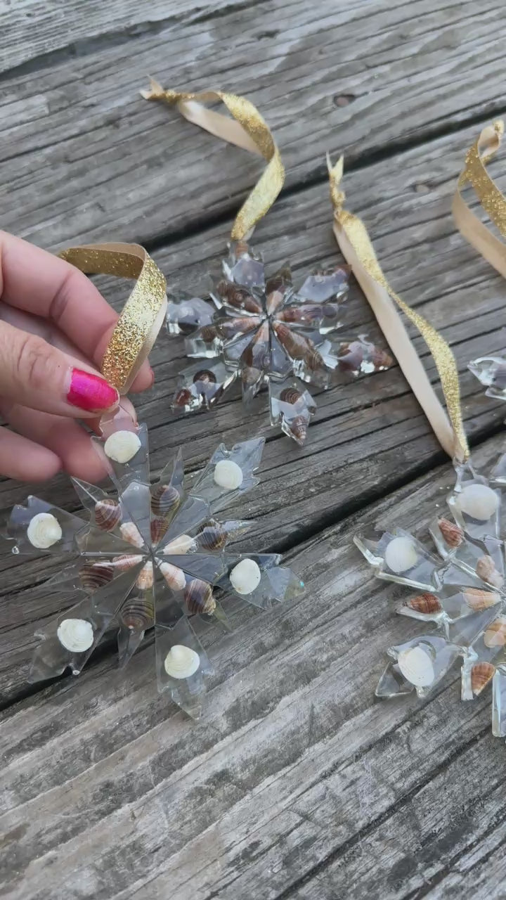 Maine seashell snowflake ornament for your coastal inspired holiday. JRS Designs Ltd ocean inspired ornaments feature small Maine coast seashells set in snowflake design with resin. Each are handmade and all a little different. These are set in resin, but are breakable they won’t shatter like glass but can break in pieces if dropped.