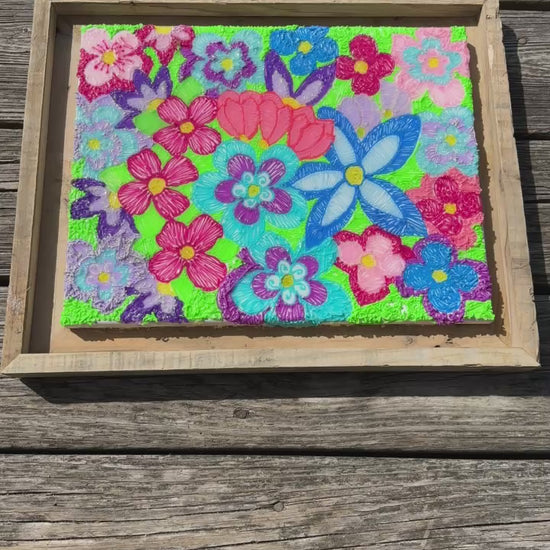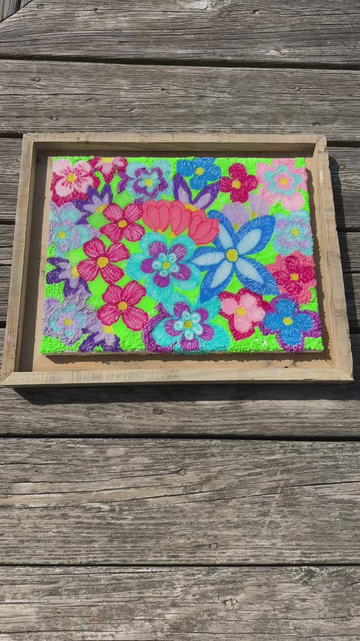 Brighten your space with this vibrant floral artwork. Featuring a stunning array of colors, this piece adds a lively touch to any room. JRSDesignsltd original artwork made using a 3D pen and finished with resin with rustic frame. One of a kind artwork. Measures 11”x 14”in picture with frame measures 14’x 17”in , frame is attached with gorilla glue it is very well attached. Handmade in Maine with love.